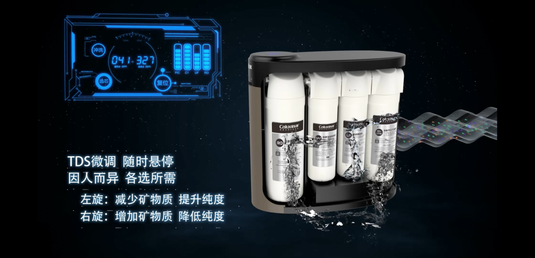 将过滤的整个过程可视化展现在消费者面前,再用文字说明净水器TDS微调,随时悬停等人性化优点。这样的展示方式给消费者留下深刻印象。